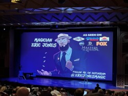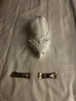 After dinner, we watched magician Eric Jones in the Walt Disney Theatre. Then, we checked out the shops and grabbed a beer to take back to our room, where we found a cute little towel animal and chocolates left by our room attendant. We were tired, so we called it an early night after relaxing on the balcony with our drinks.