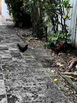January 15, 2024 – Today, we were checking out of our house in Key West and making the 6-hour drive to Orlando to spend the next few days at Disney World. I was up early and took one last walk to Cuban Coffee Queen to pick up coffee before we packed the car and hit the road. There are chickens that run everywhere in Key West – here are a few I ran into on my morning walk.