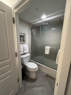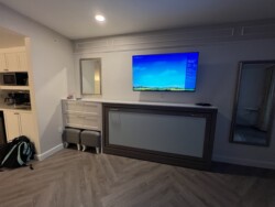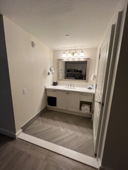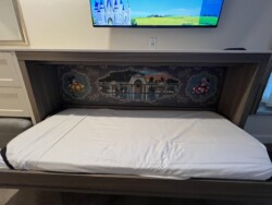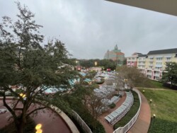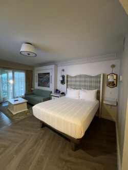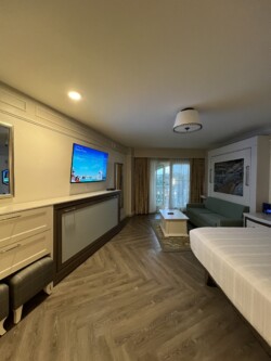 I reserved a studio at Boardwalk Villas using my DVC points, and we ended up with a room in a great location overlooking the Luna Park Pool. The studios have a queen-size bed, a double-size Murphy bed behind the couch, and a single pull-down bed below the TV. Here are pictures of our room and the view.