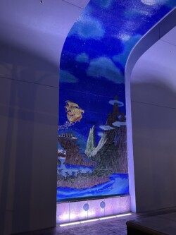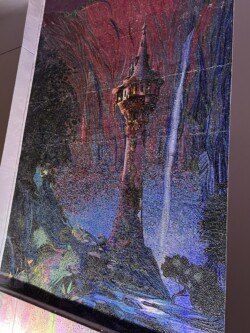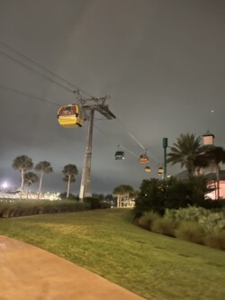 Once settled in and relaxed for a bit, we walked to the Epcot International Gateway to get on the Skyliner. It was going down for refurbishment tomorrow, and Sara and Cara wanted to ride it, so we headed out to Disney’s Riviera Resort to have a drink at my favorite pool bar, Bar Riva. The Riviera Resort is themed after the French Riviera and is so beautiful and peaceful. I stayed here last month, and it is now one of my favorite places. As you walk into the resort from the Skyliner Station, you walk under an arch with amazing mosaics on the walls. One is a Peter Pan-themed, and the other is Rapunzel. Even if you are not staying here, it is worth taking the Skyliner here to check it out, and it is a must-do for me every trip.
