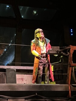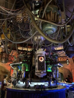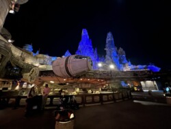 Next, we headed over to check out Galaxy’s Edge. We walked around, enjoying all the amazing Star Wars theming before riding the Millennium Falcon: Smuggler’s Run. If you are a big Star Wars fan, then you will love this section of the park. However, you don’t have to be a Star Wars fan to appreciate Galaxy’s Edge. The attention to detail is amazing, and in my opinion, the best time to visit is after dark, when it is all lit up. One of my favorite things to do is try to get a reservation at Oga’s Cantina at the end of the night. By the time you leave the bar, the park is closed, and there is no one else around except the few people leaving with you, which makes for some pretty awesome pictures.