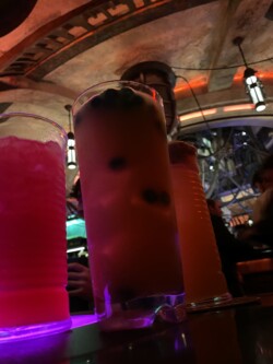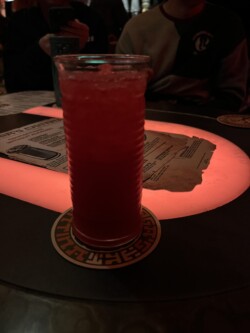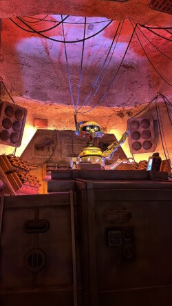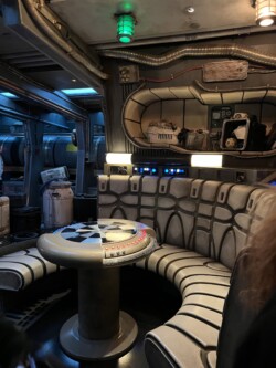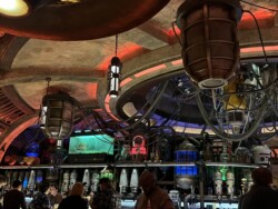 We had reservations at Oga’s Cantina for our final night stop. I originally had reservations for the end of the night, but since we were tired, I decided to see if we could check in early, and luckily, they could accommodate us. Oga’s Cantina is a fun little bar themed after a Mos Eisley Space Port. It is similar to Trader Sam’s as the space is limited, and you will most likely share a table with another party unless you get seated at the bar. The only difference between the two is Oga’s has a walk-up list that you can join if there are open seats, which I have used multiple times when I decided to come at the spur of the moment and didn’t have a reservation. We were seated in a booth (with another family) next to the stage where droid DJ R-3X, a former Starspeeder 3000 pilot, was spinning some tunes. This place is always a good time, and I try to come here at least once every couple of trips. Most of the time, it is when I am on a solo trip, so I usually get seated at the bar and have some pretty amazing people that way.
