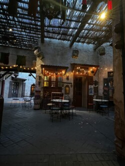 I was initially thinking of staying in Epcot for the extra evening hours available to deluxe resort guests, but the crowds were pretty heavy, and I decided I didn’t want to deal with them, so on my way out, I stopped in Morocco to get one of the last things on my must-try food lists. I ordered the Mediterranean Flatbread and Pomegranate Mimosa and found a table in my favorite part of the pavilion to enjoy them.